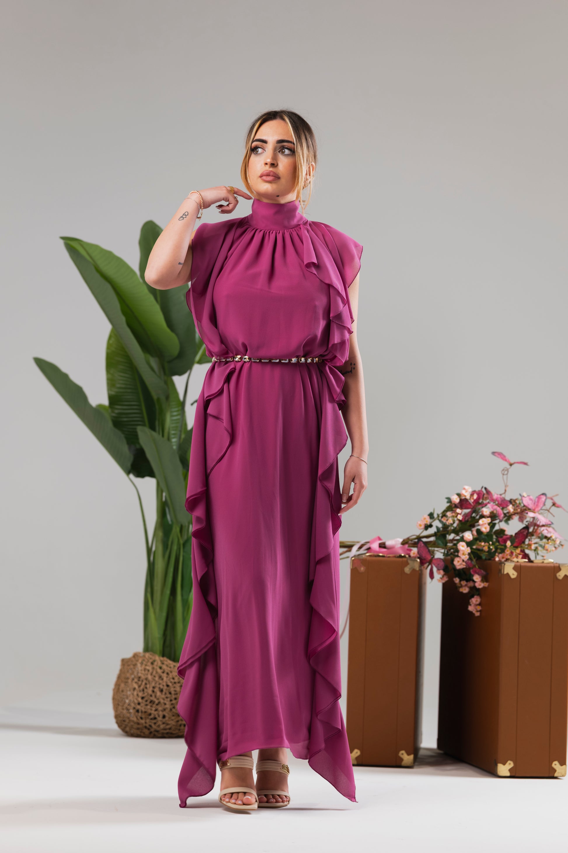 Abito lungo elegante in tessuto fluido color magenta, caratterizzato da un collo alto con arricciature e maniche corte a mantella. Le balze verticali lungo i lati aggiungono movimento.