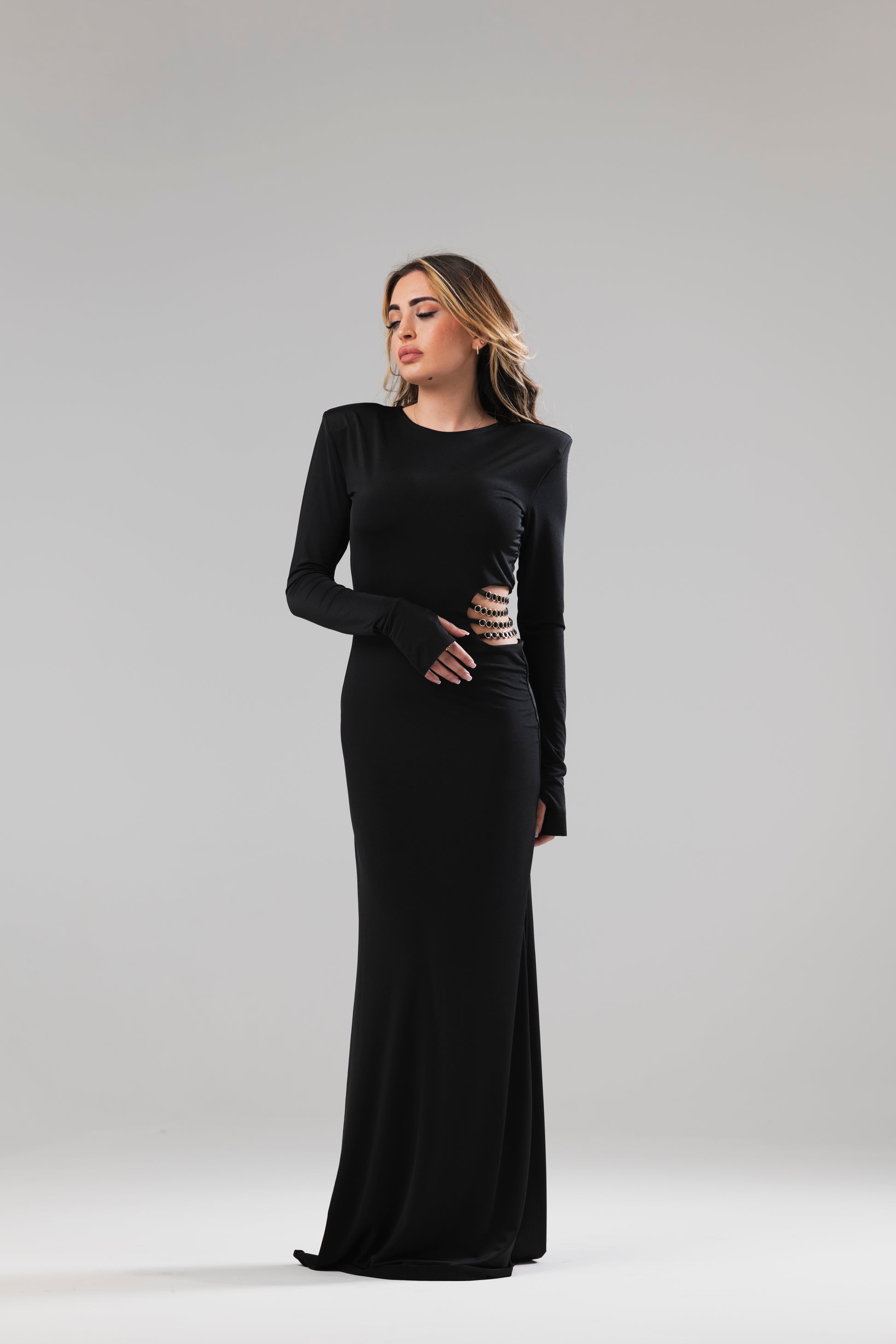 Abito lungo super modellante con maniche lunghe con spalline e manicotti,dettagli cut-out decorati da catene laterali dona un’aria elegante, sensuale e moderna.
