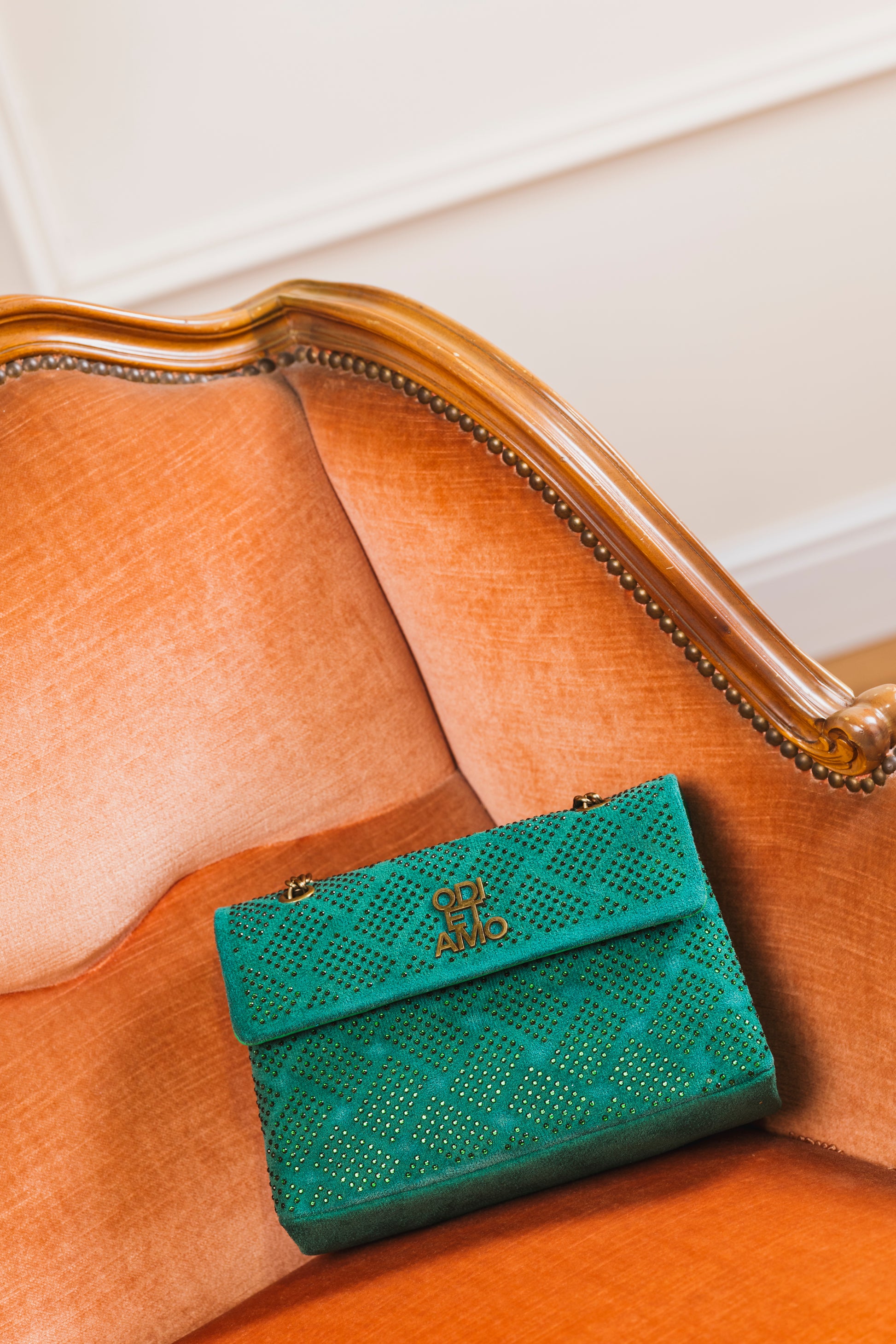 Borsa in tessuto con cristalli verdi,composta con due scomparti interni.