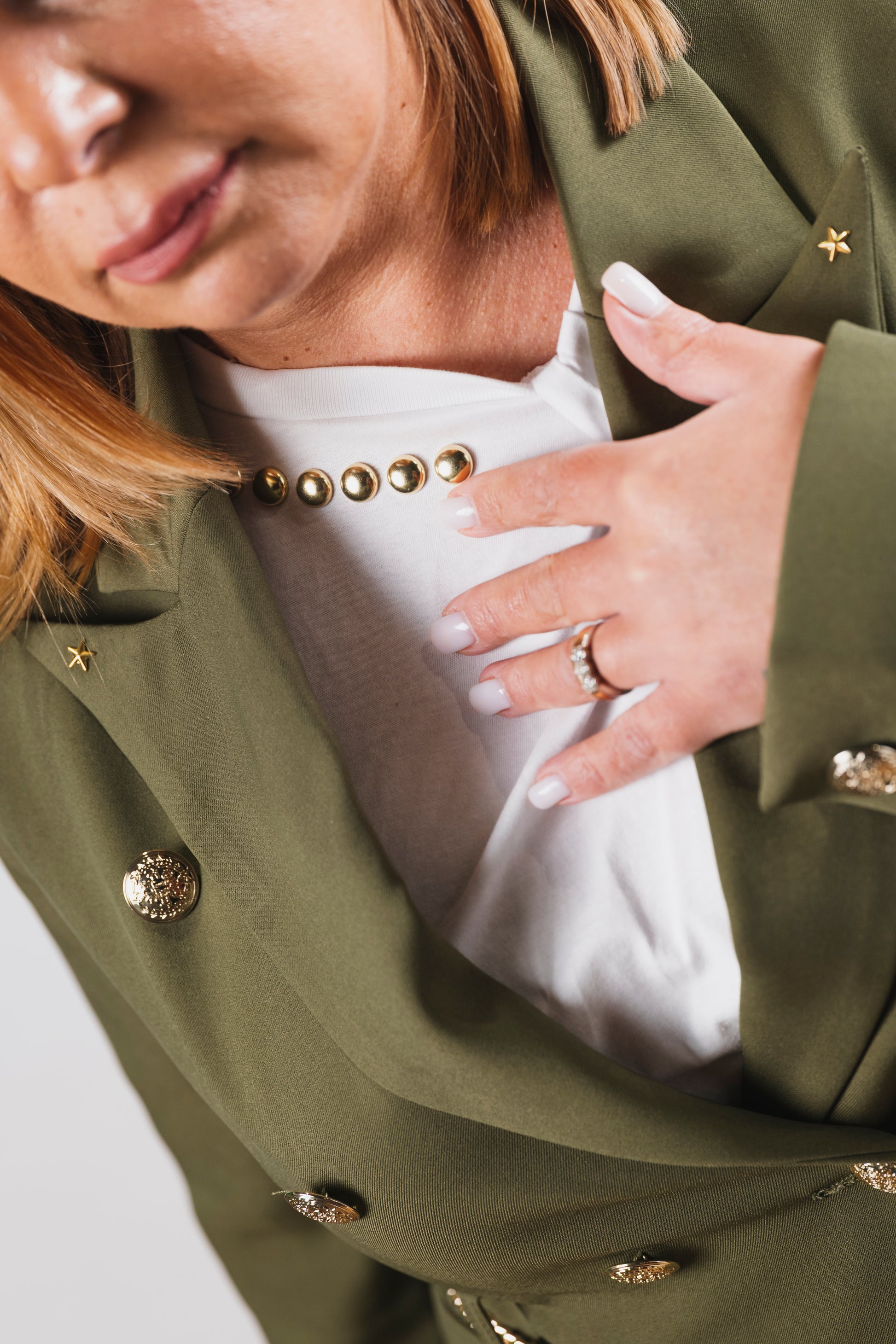 Blazer con taglia a X,bottoni dorati,spalle appuntite.