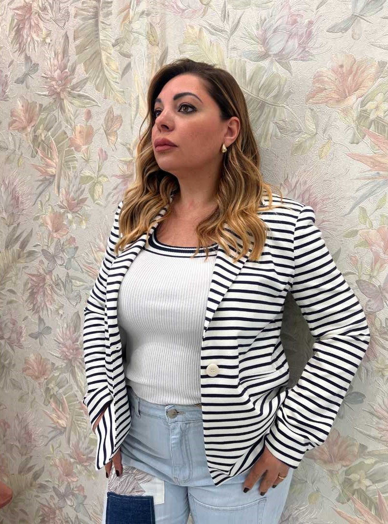 Giacca a fondo bianco con righe blu, bottone in bianco e finte tasche sul davanti.