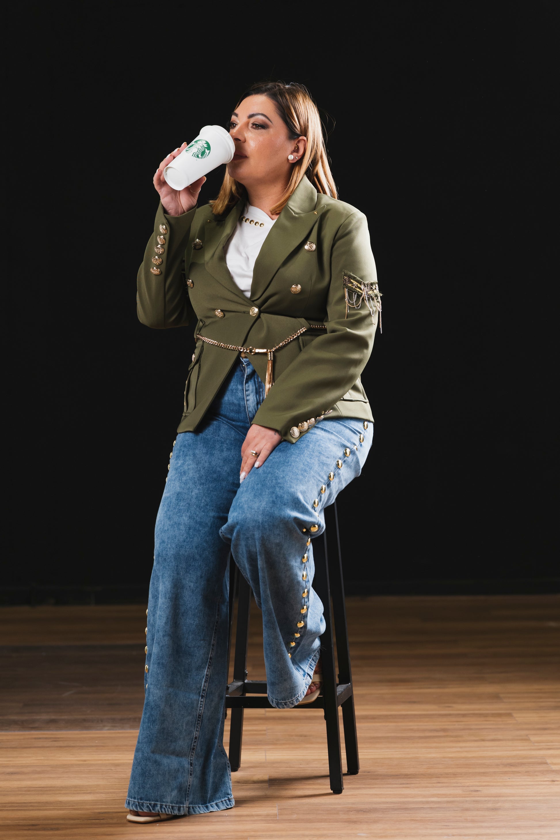 Jeans a gamba larga in cotone,a vita alta con borchie oro nei lavati.