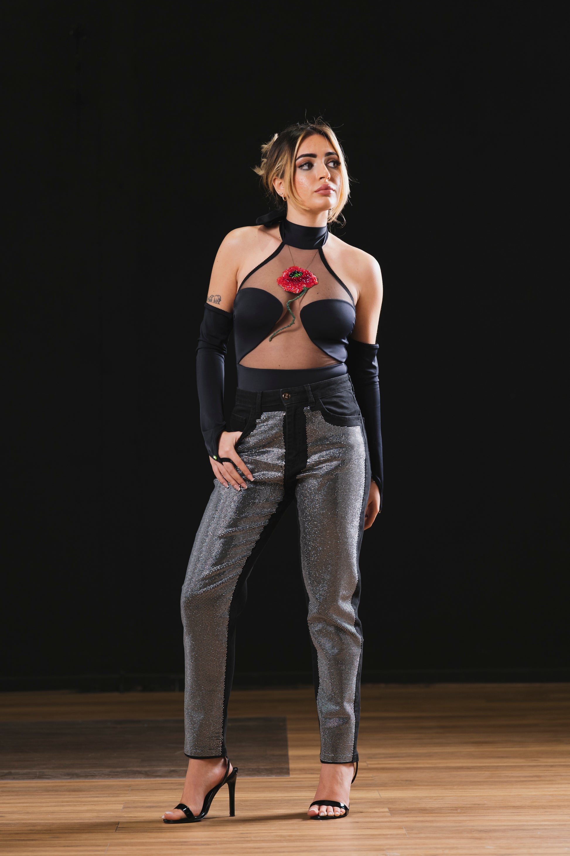 Denim skinny con cristalli.