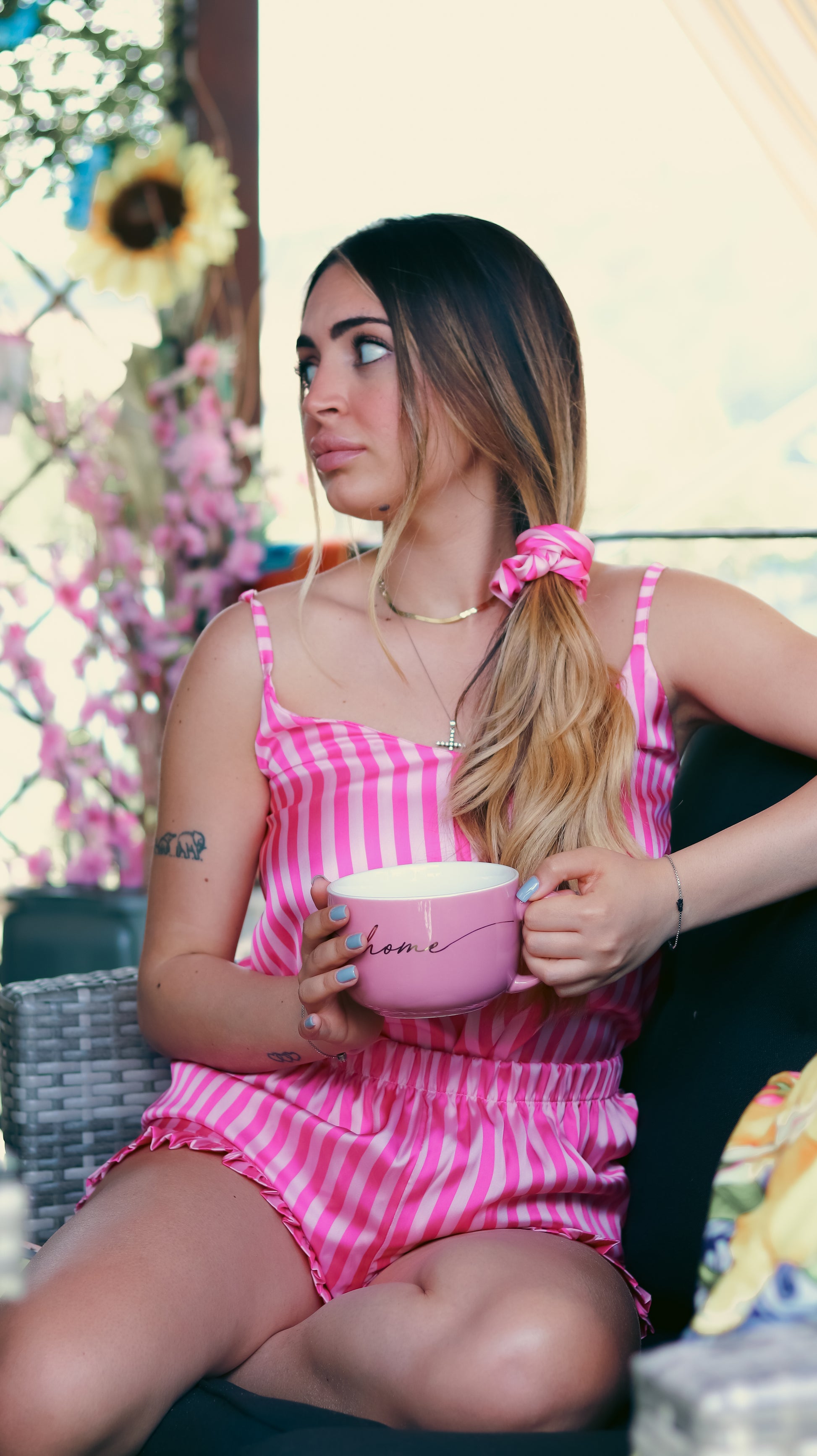 Pigiama a righe rosa,totalmente in raso di filo d’angelo